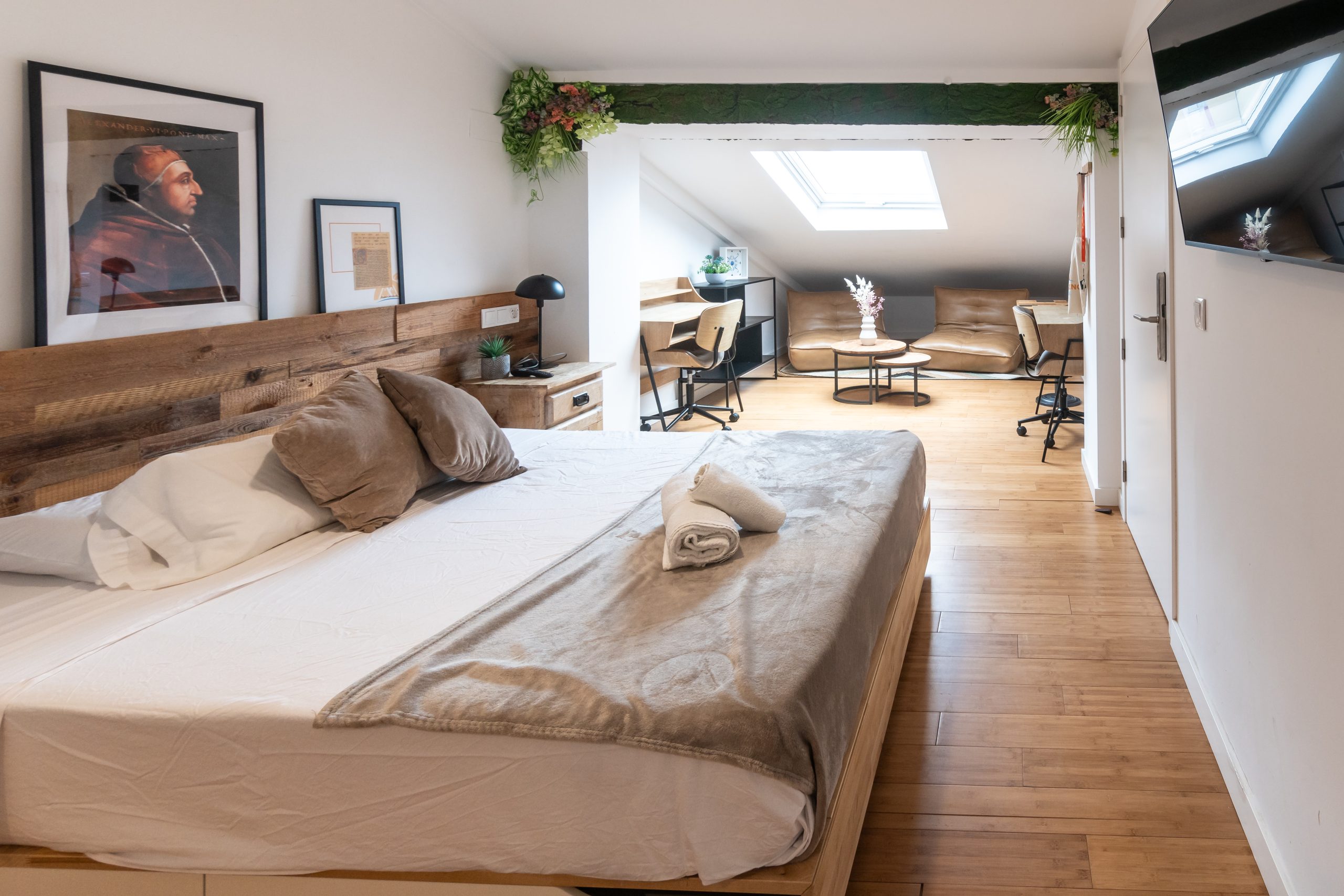 A marvelously converted attic with a large skylight and 30 m2 of space. It comes furnished with two comfortable single beds (or one double bed), a fully equipped kitchenette, a bathroom in a modern design with all the space you need for your toiletries and large wardrobes where you can store your clothes and other items allowing you to organize your belongings as you like. What’s more, there are two desks so you can study or work with absolute concentration and be very productive. Malvarrosa beach is 500 m away, the supermarket only 50 m, and there is a bakery literally across the street. The tram/subway lines are approx. 400 m away from the house, and the nearest bus line that will take you downtown is only 50 m away. The house is located right by the sea in a residential neighborhood with traditional houses.