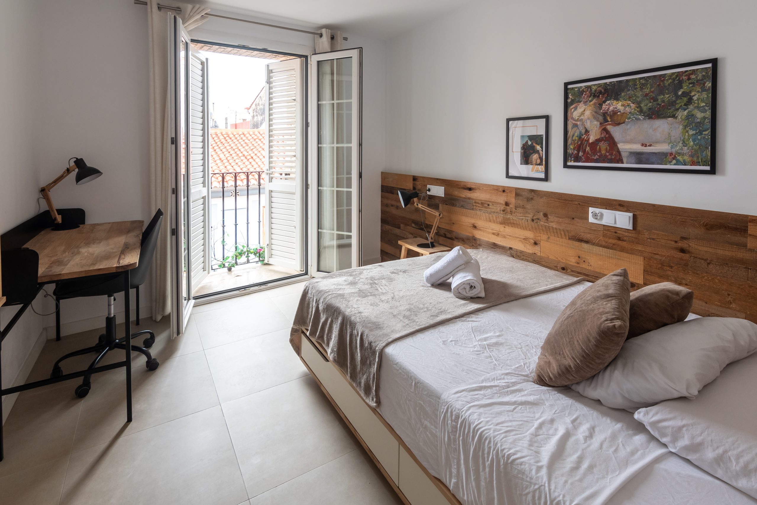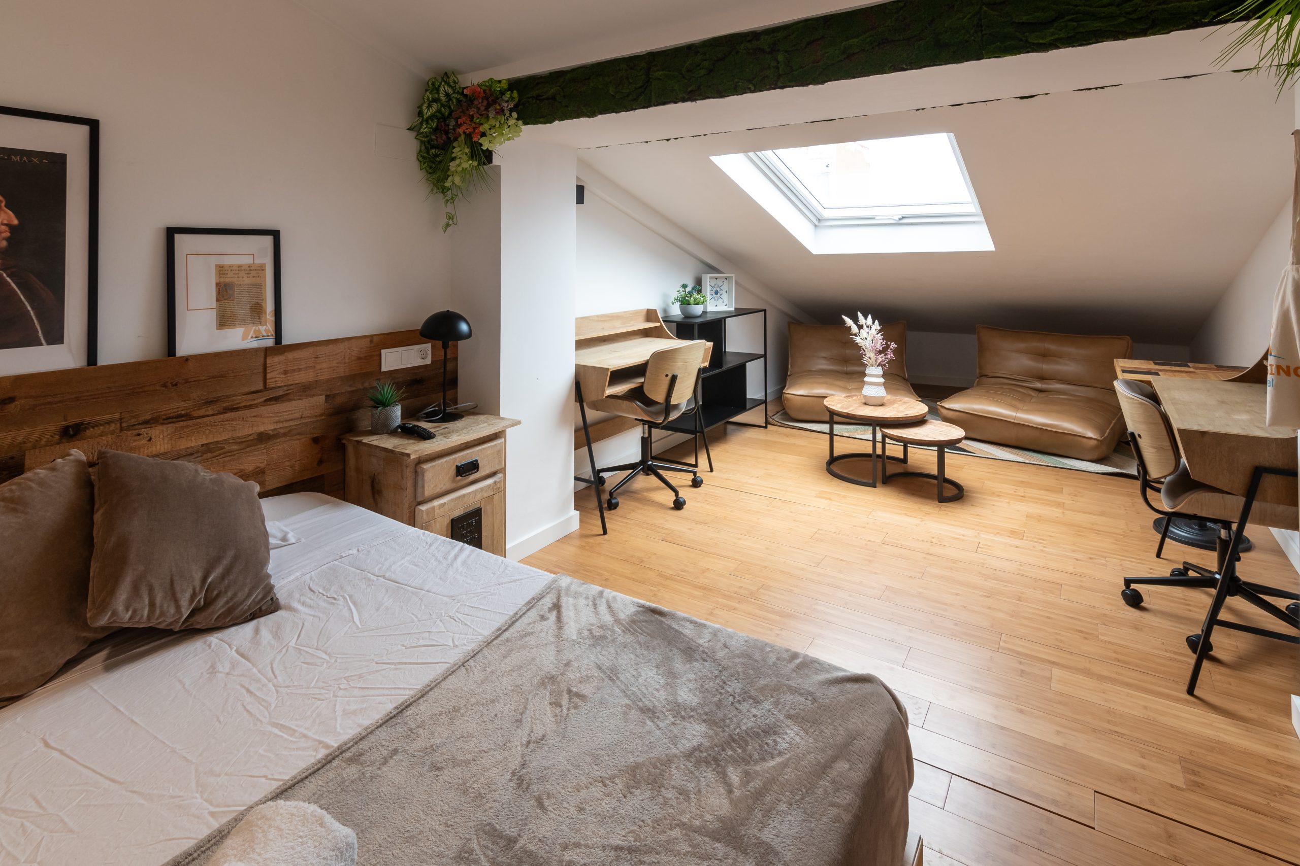 The converted attic is located on the third floor, where two studios have been built in perfect symmetry— with spacious ceilings stretching upward more than 3 meters in the highest part and a living area with sloped ceilings and a Velux® skylight. It’s a great way to enjoy the starry sky as it twinkles over Valencia. Each studio has a fully equipped kitchenette (including refrigerator, microwave, induction cooktop, coffeemaker, sink) so you’re not forced to leave the room anytime you get hungry.